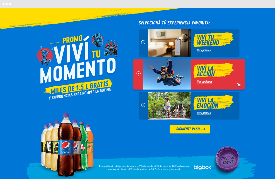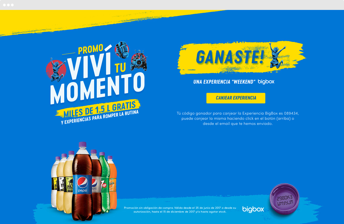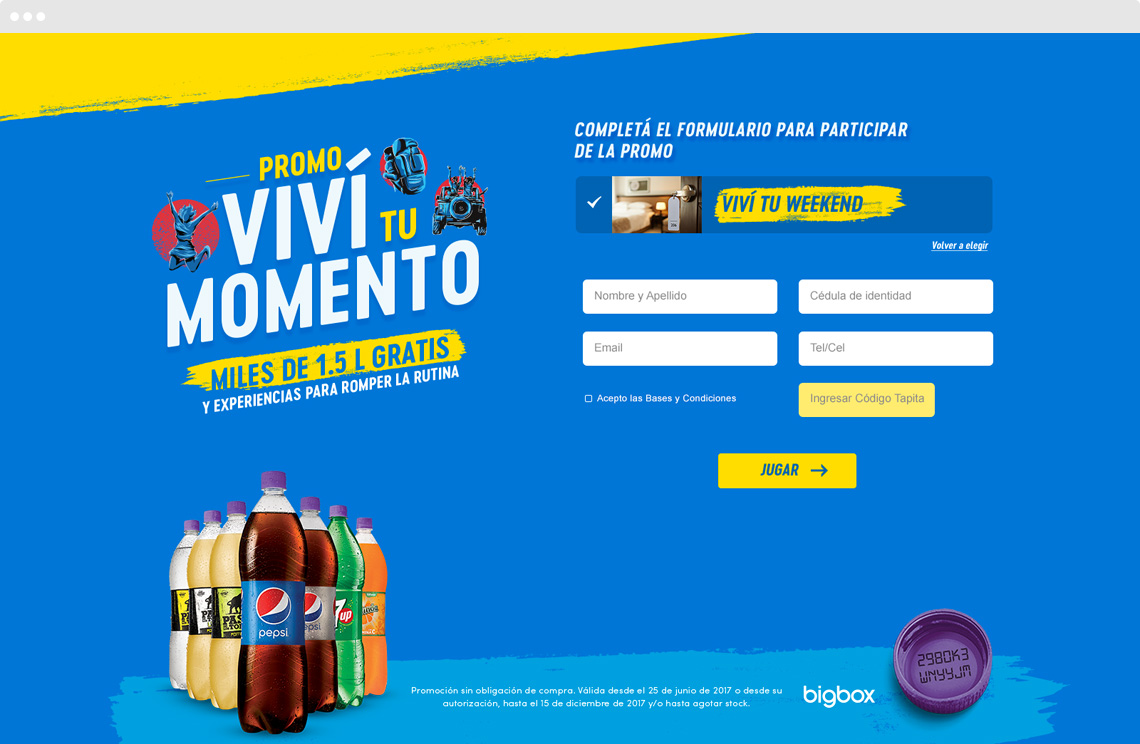 Diseño y desarrollo de sitio web de la promoción "Viví tu momento" para Pepsi. La promo consistía en elegir una experiencia, luego ingresar el código de tapita y finalmente se genera un resultado.